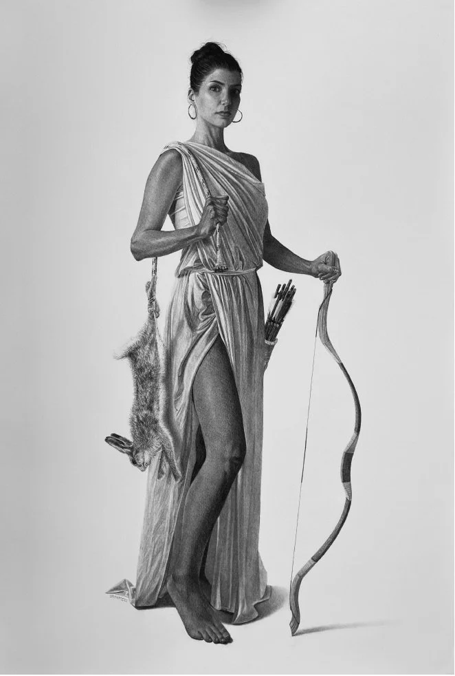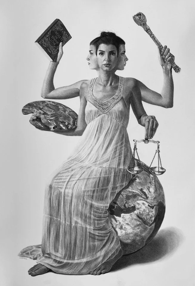 Shihadi’s work oscillates between classical-figurative realism, which dutifully captures and records that which surrounds her and fantastical surrealism which draws from the artist’s preoccupations with mysticism. She employs a dramatic approach to hyperrealism sketching using chiaroscuro to form a magical reality that blends both fiction and fantasy.