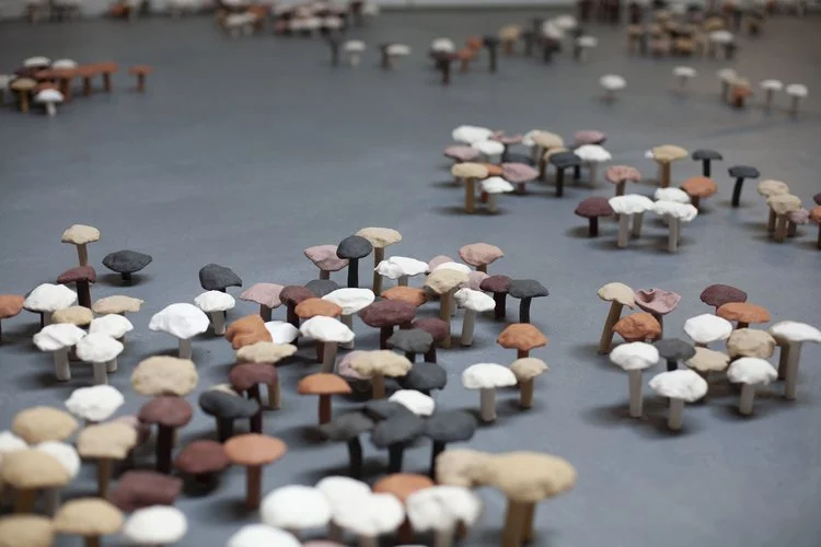 Chakraborty’s upcoming art installation CAN YOU DIVIDE THE SKY? comprises sculptures, drawings and poems. It explores stories of identity and puts forward questions around our coexistence, borders and migration. The works will be connected in material and textual practices, and a multitude of clay mushrooms will sprout throughout the installation. The mushroom installation is the result of multiple participatory workshops in which refugees, migrants, and locals shared their stories and engaged in crafting mushrooms as an enriched community experience. The hue of the mushrooms alludes to the skin color of the hands that sculpted them. Chakraborty says: "Mushrooms migrate. They grow wherever they find nutrients. And so, I started depicting people as these little mushrooms. Just like in a natural ecosystem, we are also connected by our stories and experiences.“