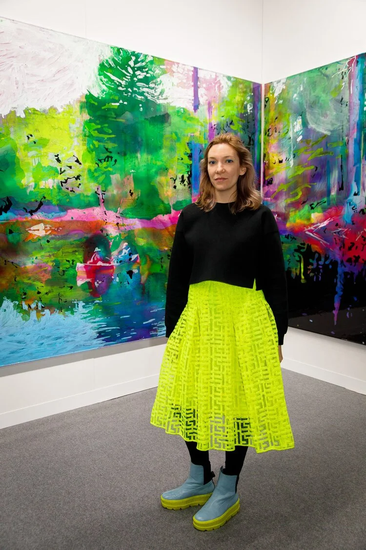 Ariel Adkins in front of an artwork by Steve Driscoll, presented by Angell Gallery, Toronto, at VOLTA New York 2018