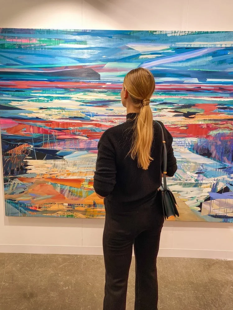 Magdalena Getreuer in front of a painting by Theresa Möller at VOLTA Art Fair in 2021.